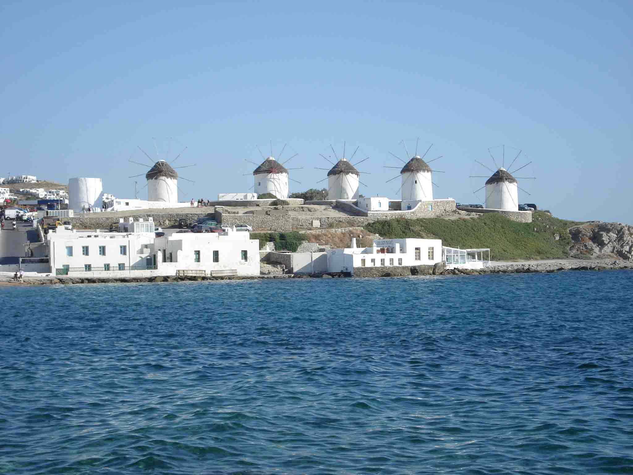 米克諾斯島是希臘南部基克拉澤群島中的一座,也是愛琴海上最享盛名的度假島嶼之一。島上居民很少,每年大約半年的非旅游時(shí)間,島上相當(dāng)安靜。四月以后,旅游季節(jié)開始了,來自世界各地的游客就像候鳥一樣絡(luò)繹不絕地飛來島上,享受地中海的陽光和海灘。在島上漫步,看到房頂都是用大石塊壘起的平頂,覺得很奇怪。問了當(dāng)?shù)氐木用窈蟛胖溃瑣u上冬天寒冷,風(fēng)特別大,只有這些結(jié)實(shí)的屋頂才能抵御寒風(fēng)。在島西南面海邊的小山丘上,有5座基克拉澤式的風(fēng)車,這是米克諾斯島的標(biāo)志。