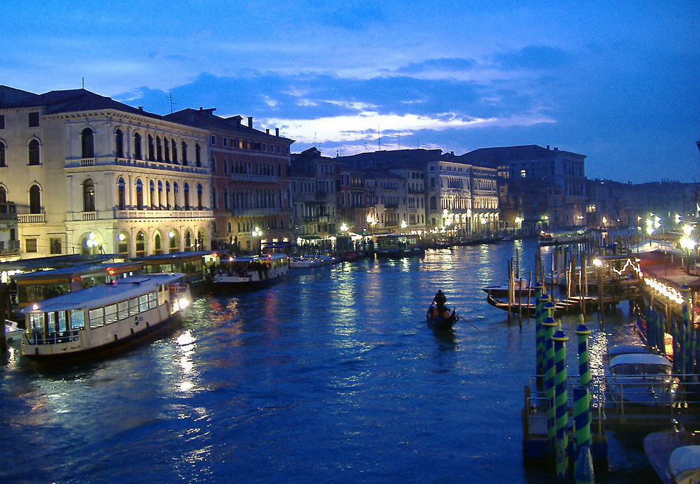 晚上乘一小時貢多拉的花費可以乘“水上公交”(Vaporetto)繞威尼斯30圈,可是即便昂貴,你又怎么舍得放棄夜游威尼斯的終極浪漫?夜晚的水面倒影著月色,經(jīng)過一天的喧囂,此時的河面重歸平靜,貢多拉在如絲般的碧波上靜靜前行。兩岸爬滿青苔的古老墻根發(fā)出特殊的潮濕氣味,仿佛伸手可觸。