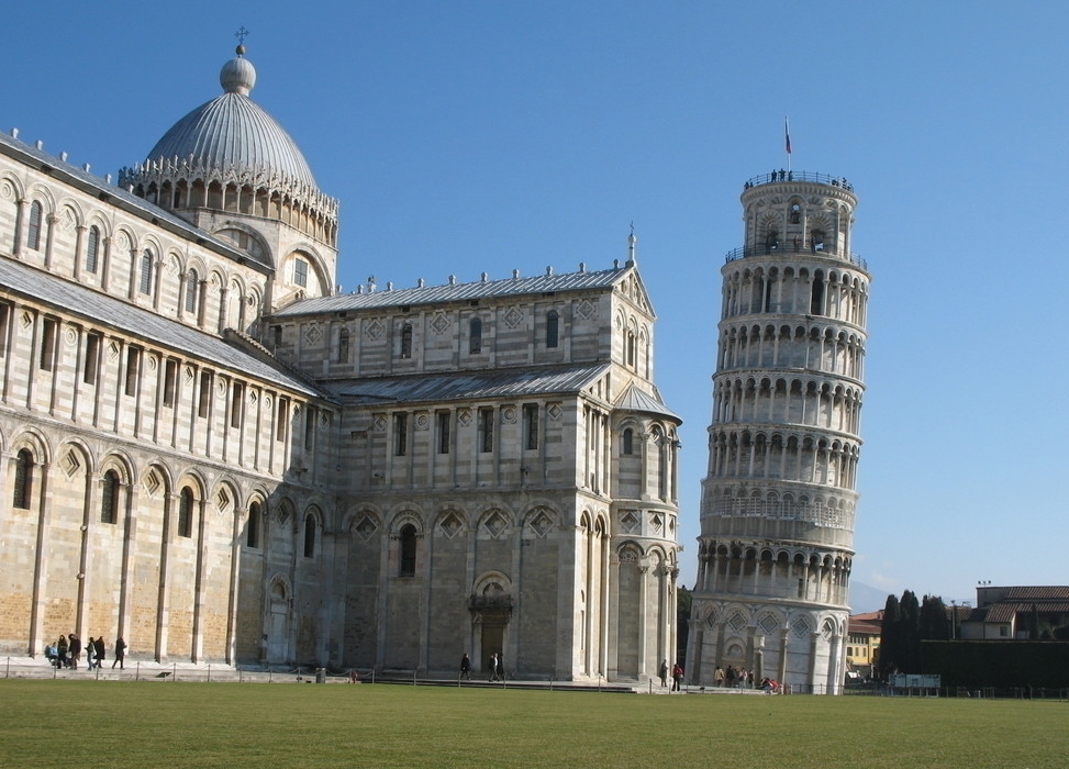 比薩斜塔(意大利語(yǔ):Torre pendente di Pisa或Torre di Pisa)是意大利比薩城大教堂的獨(dú)立式鐘樓,于意大利托斯卡納省比薩城北面的奇跡廣場(chǎng)上。廣場(chǎng)的大片草坪上散布著一組宗教建筑,它們是大教堂(建造于1063年—13世紀(jì))、洗禮堂(建造于1153年—14世紀(jì))、鐘樓(即比薩斜塔)和墓園(建造于1174年),它們的外墻面均為乳白色大理石砌成,各自相對(duì)獨(dú)立但又形成統(tǒng)一羅馬式建筑風(fēng)格。比薩斜塔位于比薩大教堂的后面。