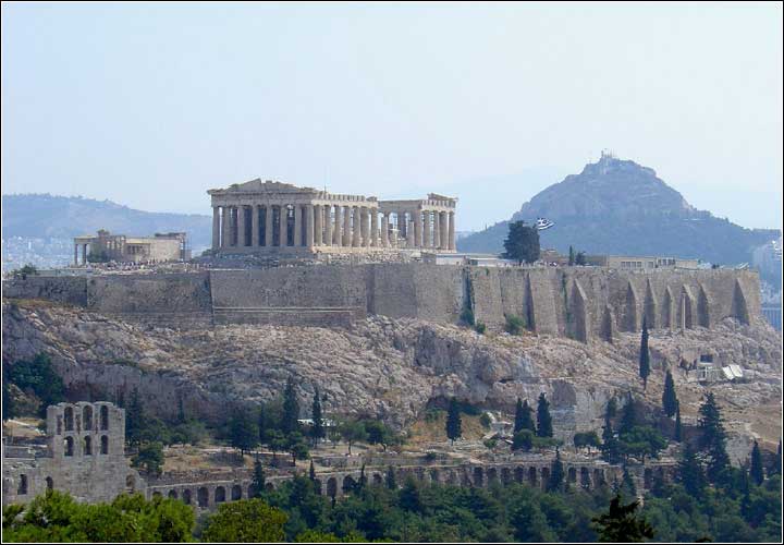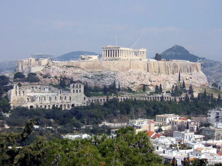 雅典,希臘語為“阿克羅波利斯”,原意為“高處的城市”或“高丘上的城邦”,距今已有近2600年的歷史。雅典衛城遺址位于今雅典城西南,建造在海拔150米(此數據據中文版美國國家地理雜志2004年8月號,另一資料為156米)的石灰巖山岡上,是祭祀雅典守護神雅典娜的神圣地,建筑群建設的總負責人是雕刻家菲迪亞斯。衛城,原意是奴隸主統治者的圣地,古代在此建有神廟,同時又是城市防衛要塞。