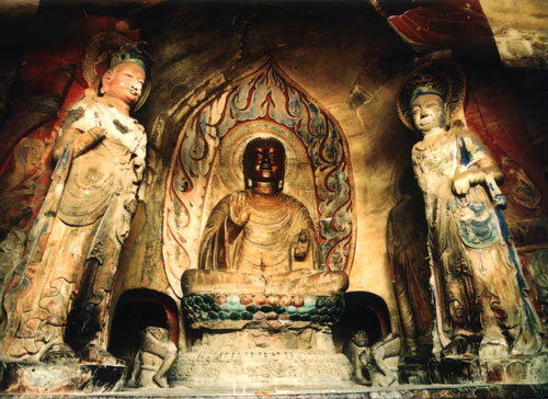 這種窟的形制基本上因襲了北魏后期龍門產(chǎn)生的三壁三龕窟(如龍門的石窟寺、魏字洞等)形式。