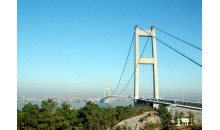 江陰長江公路大橋,位于江蘇省江陰市黃田港以東3200米的西山,主跨1385米(328+1385+295),橋塔高190米,為兩根鋼筋混凝土空心塔柱與三道橫梁組成的門式框架結構,重力式錨碇,主梁采用流線型箱梁斷面,鋼箱梁全寬36.9米,梁高3米,橋面寬29.5米,雙向六車道,兩側各設寬1.8米的風嘴,1999年建成。