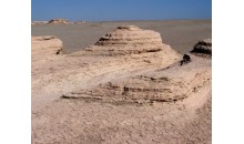 且末古城位于且末縣城西南約6公里的老車爾臣河岸臺地上,海撥款1,273米,遺址地表無植被,已沙化,呈雅丹地貌。在東西長約1公里,南北寬200米的范圍內(nèi),地表散布著大量陶片及鐵塊,煉鐵渣,曾采集到數(shù)件磨盤石殘塊,玻璃片,料珠。此外,在遺址中心區(qū)風(fēng)蝕地表,尚殘存數(shù)間房屋及其他建筑遺址,1985年9月挖掘出的古代毛織品,古尸,遍地尸骨墓室,還有陶片弓箭。