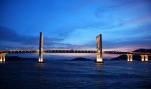澳門“友誼大橋”,工程原稱新澳氹大橋,1994年初建成通車。位于舊大橋(嘉樂庇總督大橋)以東,連接澳門半島新口岸水塘北角(外港碼頭處)與氹仔北安碼頭。橋寬15米,設兩條雙線車道,中設分隔線,車道兩旁設1.5米寬的行人道。