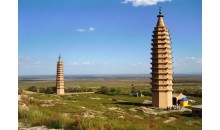 拜寺口雙塔是一對磚砌佛塔山口東側的塔稱為東塔是一座正八角形建筑,高13層,每層塔檐下,各面都有各種獸頭的浮雕,西塔也是13層高,較東塔粗壯外形呈拋物線狀,曾發現梵文、西夏文題記和元代銀幣等。在銀川市西北約50公里處的賀蘭山東麓的拜寺口內,坐落著一對古塔,它們就像兩個孿生兄弟守衛在山口兩旁,顯得格外挺拔。拜寺口雙塔坐落在賀蘭縣西部的拜寺口。