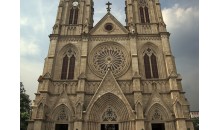 廣州石室天主教堂在市區(qū)一德路,清同治二年奠基,光緒十四年落成,歷時二十五年,是全國最大的一座以高直尖頂為特色的哥特式教堂。教堂結(jié)構(gòu)為一巍峨高聳的雙尖石塔,其上掛有大鐘一組,堂深78.69米,東西寬35米,高度由地面至天面平臺為28.7米,由天面平臺至塔頂端為29.8米,共高58.5米,堂內(nèi)是尖形肋骨尖叉的拱形穹窿,正面的大門和四周玻璃鑲嵌,可避免室外強光射入,使室內(nèi)光線保持柔和。