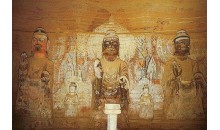 五佛沿寺石窟位于景泰縣東面的五佛鄉,距景泰縣城20公里。五佛沿寺即沿寺石窟。石窟中有五尊大佛,又名五佛寺??邇葍膳杂行》鹎ё?,俗稱千佛寺。石窟進深9米,寬7米,中間有5米寬方形柱直抵窟頂,塔柱四面開龕,龕內各塑像一尊。前面釋迦佛為清康熙年間重修,其余三尊形態各異神態自若,腰細面圓,方頤突出,屬宋代晚期作品,窟后南北二角各塑一尊泥佛坐于束腰蓮座之上,較前者造型高大,金面豐腴,體態端莊,均內著“僧祗支”下著裙,外著袈裟,其造像特點大抵為晚唐和五代遺存。